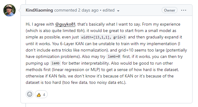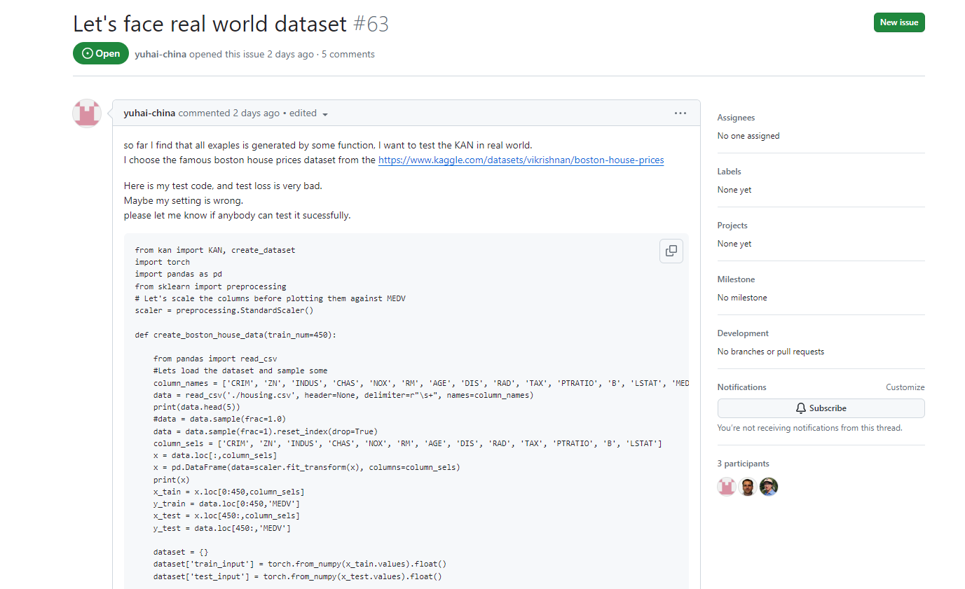 I found an open GitHub issue on the official repository for the project that was about using KANs on the popular Boston house prices dataset.