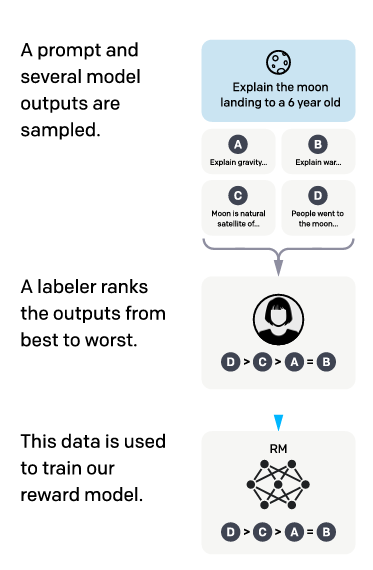 This model takes a prompt and a pair of responses as input and outputs a scalar reward for each response based on how well it aligns with labellers’ preferences (a proxy for human preferences).