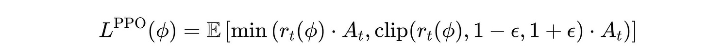 PPO then uses a Clipped surrogate objective (shown below) that: