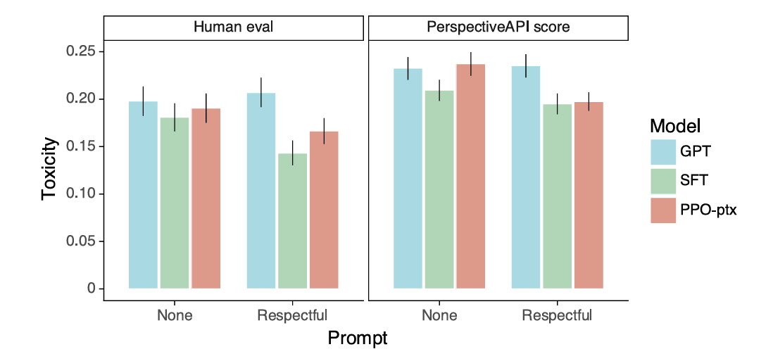 InstructGPT models also showed improvements in truthfulness and did not produce toxic output as much as compared to the pre-trained GPT-3.