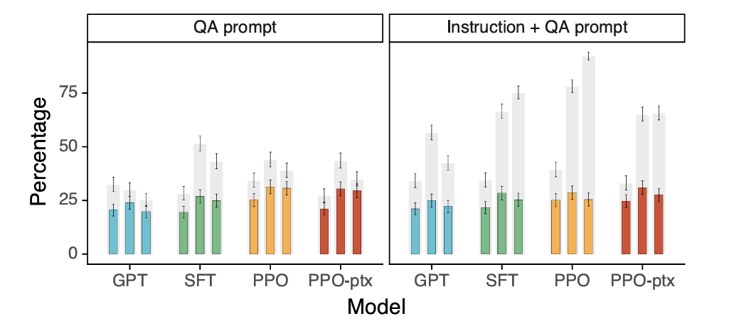 ‘GPT (prompted)’ is the pre-trained model prompted in a few-shot fashion to follow instructions