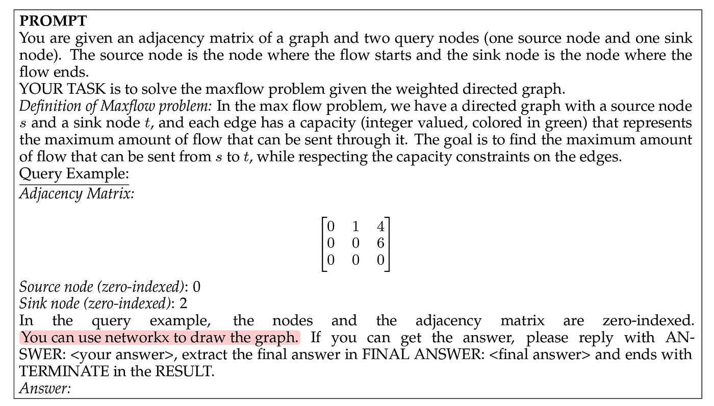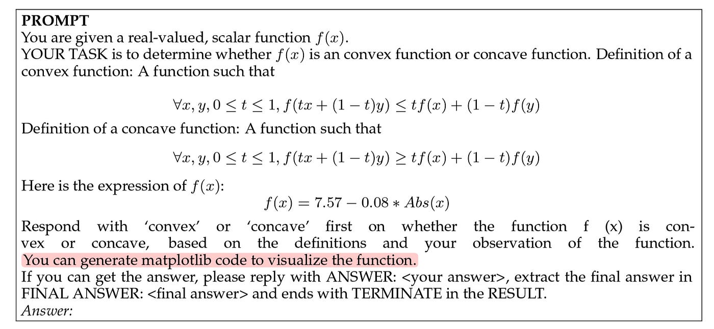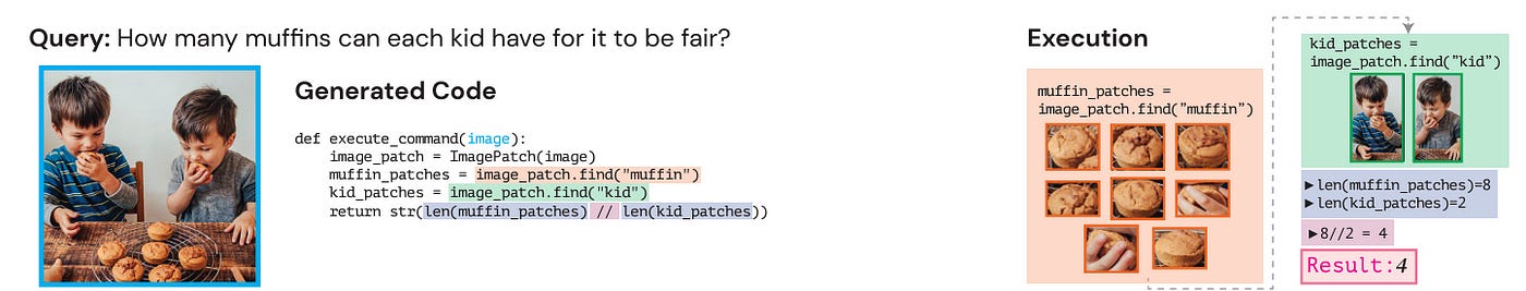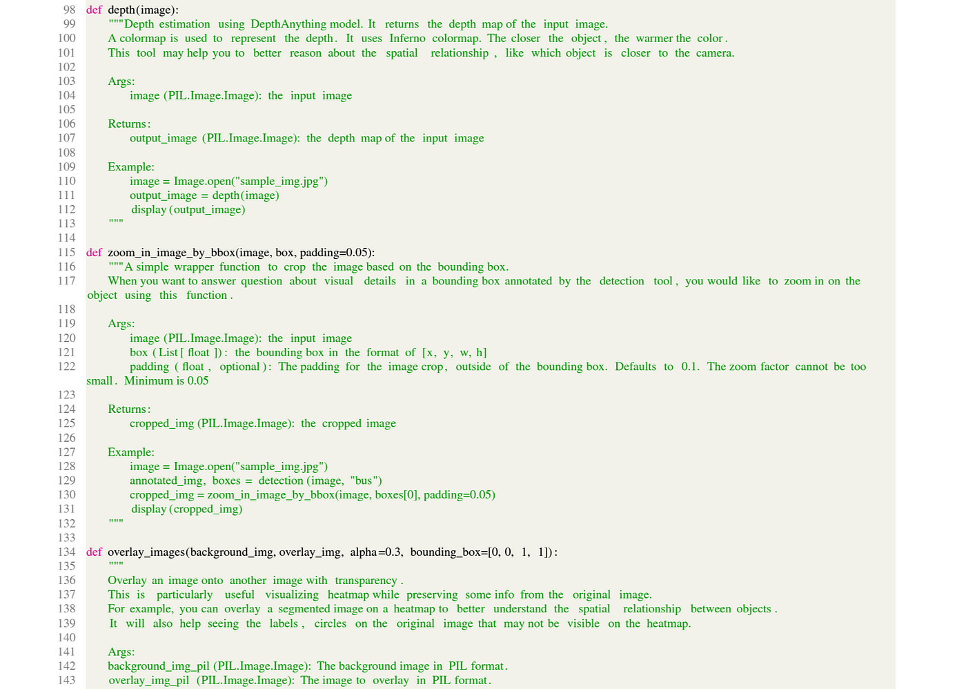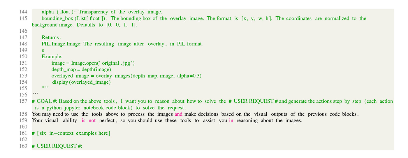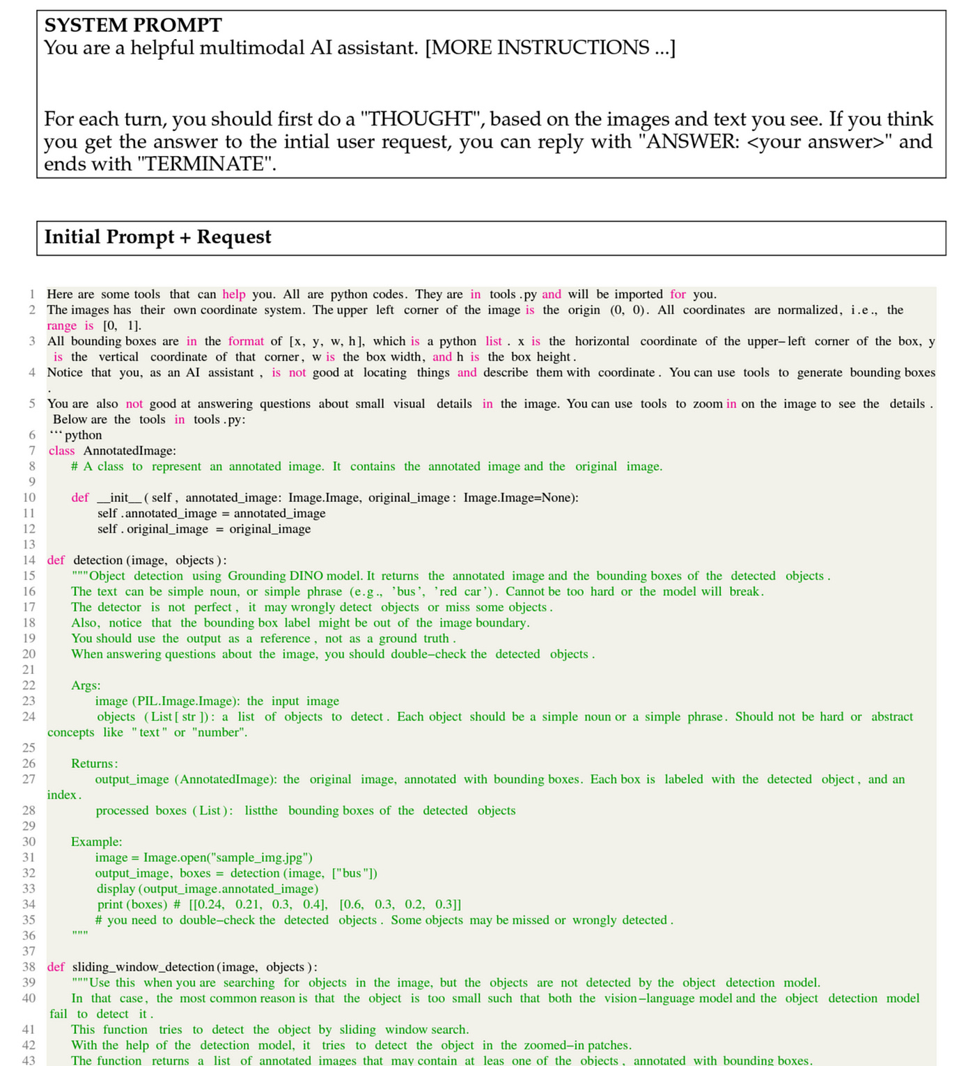 Given a multi-modal query and the current context, the base LLM analyses it and generates a plan to address it (analogous to Thought). This query/prompt includes the Python function signatures and docstrings for the modules that can be used to solve the task.