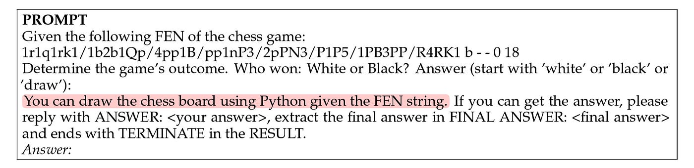The following prompt is given to the LLM, which uses Python’s chess library to draw chess boards based on the Forsyth–Edwards Notation.