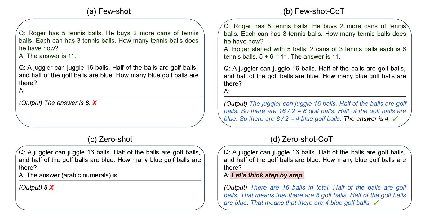 This approach is improved with Zero-shot Chain-of-Thought prompting, which simply involves adding “Let’s think step by step” to the original prompt.