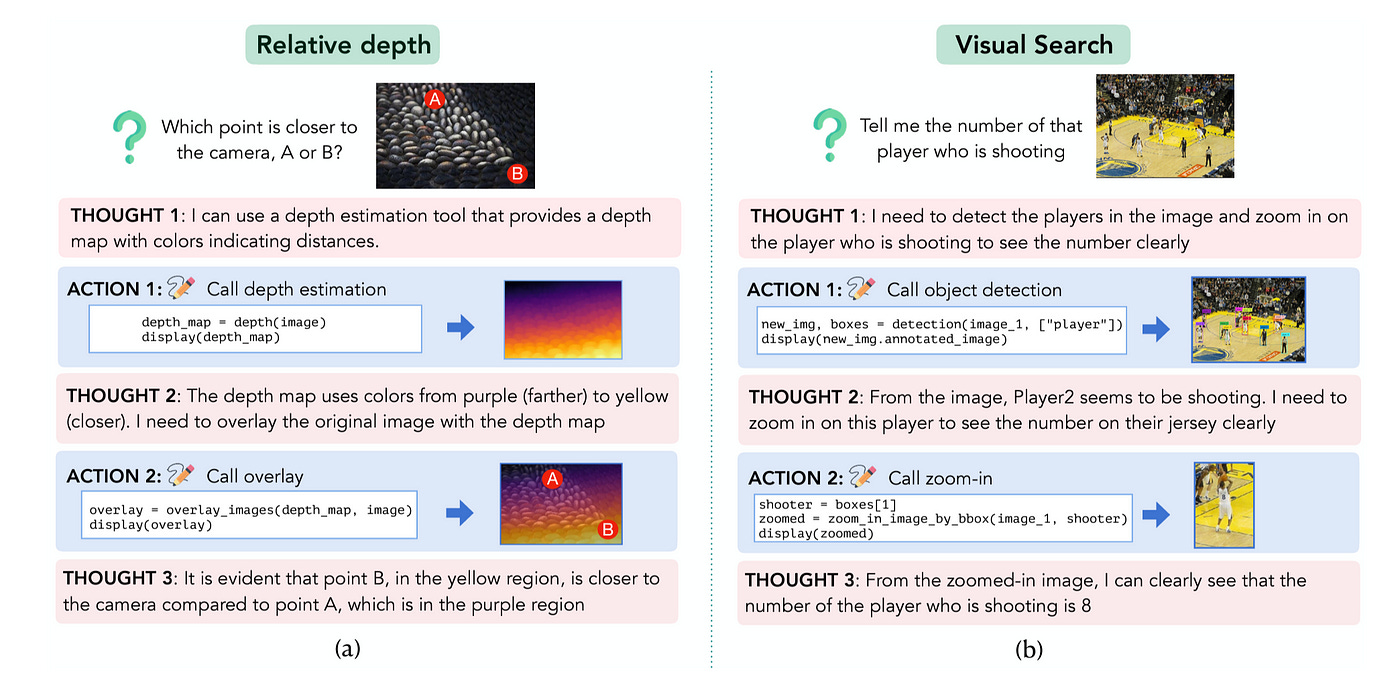 LLMs are prompted to use different specialist vision tools to sketch and manipulate the given images to solve these tasks, as displayed below.