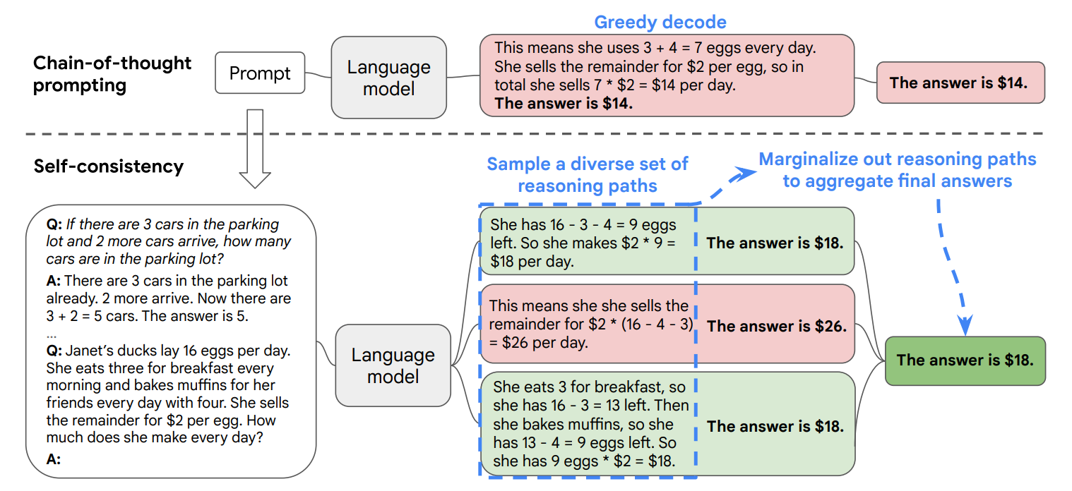This led to a new decoding strategy called Self-Consistency, which samples the model to generate multiple reasoning paths and chooses the most consistent answer out of them.