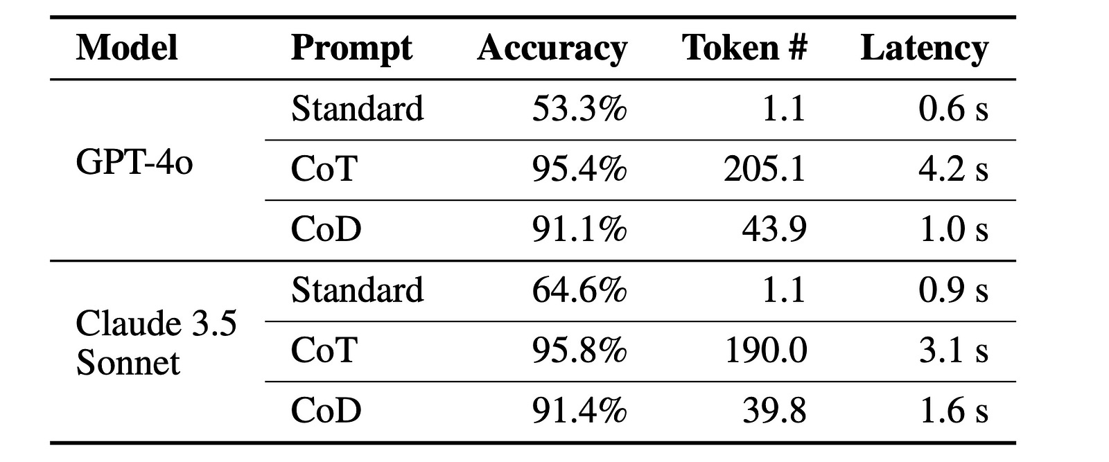 Note how CoD impressively reduces the average output tokens for CoT prompting from 189.4 to 14.3 (a 92.4% reduction) when used with Claude 3.5 Sonnet for the Sports Understanding task!