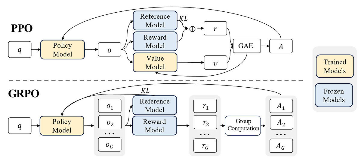 GRPO removes the critic/value model and computes advantages based on the relative rewards of a group of sampled outputs.