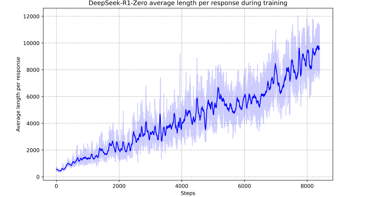 With more and more RL training, the researchers observe that the model learns to solve increasingly complex problems by increasing test-time computation and generating thousands of reasoning tokens to think through in depth.