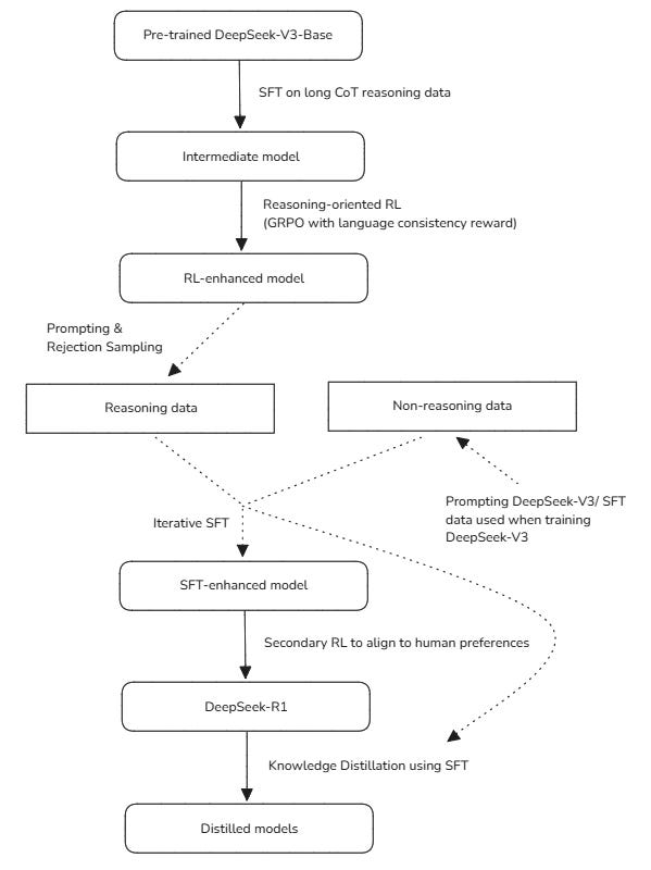 Training the base model this way leads to DeepSeek-R1-Zero.