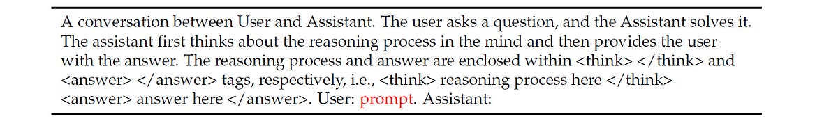 This template is intentionally kept simple so that the model explores and evolves based on what it finds best (instead of prompting the model to follow a specific reasoning strategy).