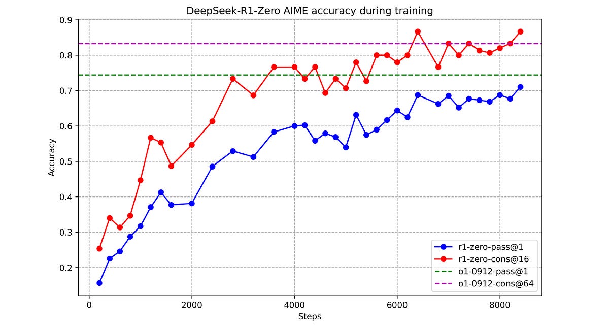 As the RL training progresses, DeepSeek-R1-Zero’s first-pass (pass@1