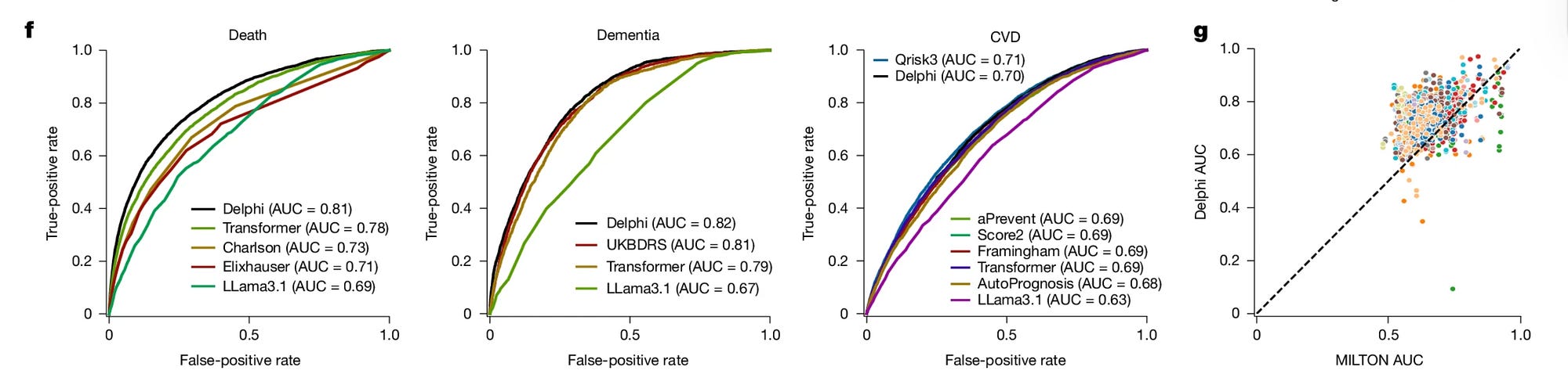Delphi-2M showed an AUC score of 0.76 (out of 1.0) across all diseases, which is pretty impressive.