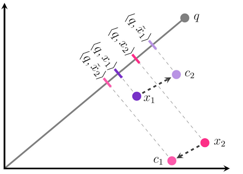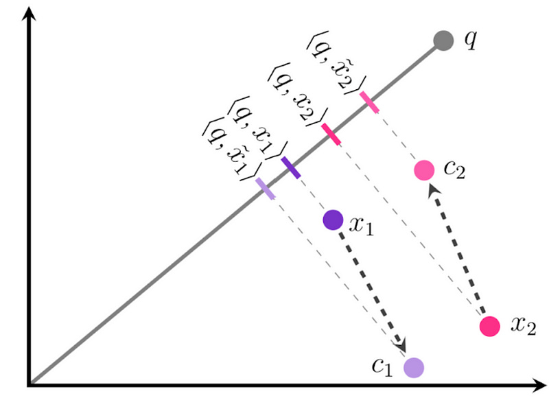 In the example, database embeddings x1 and x2 are quantized to cluster centres c1 or c2. Their quantized versions are called x̃ 1 and x̃ 2, respectively and q is the query vector.