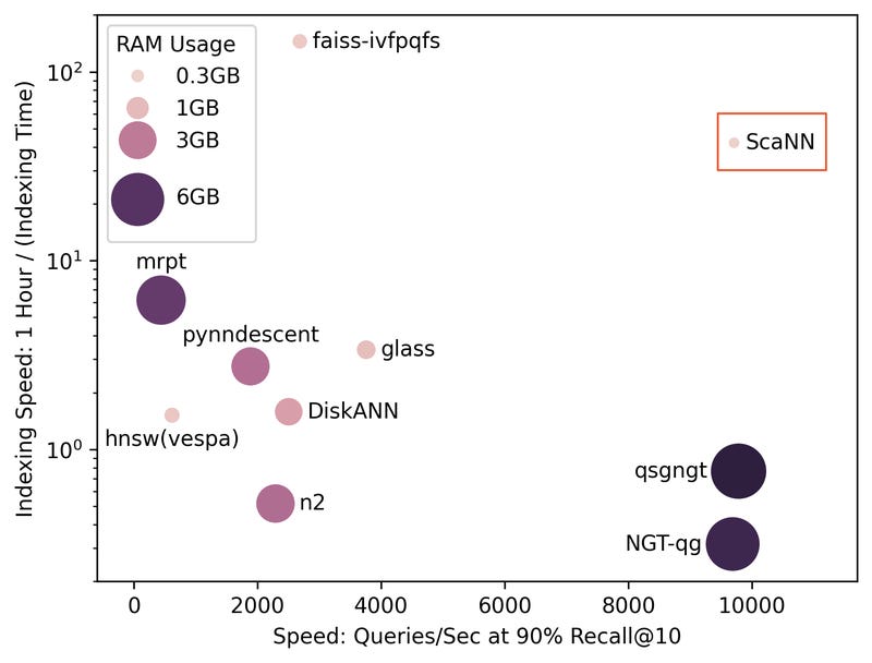 It is so good that similar libraries to match up with ScaNN’s performance require over 10× memory and 50× indexing time.