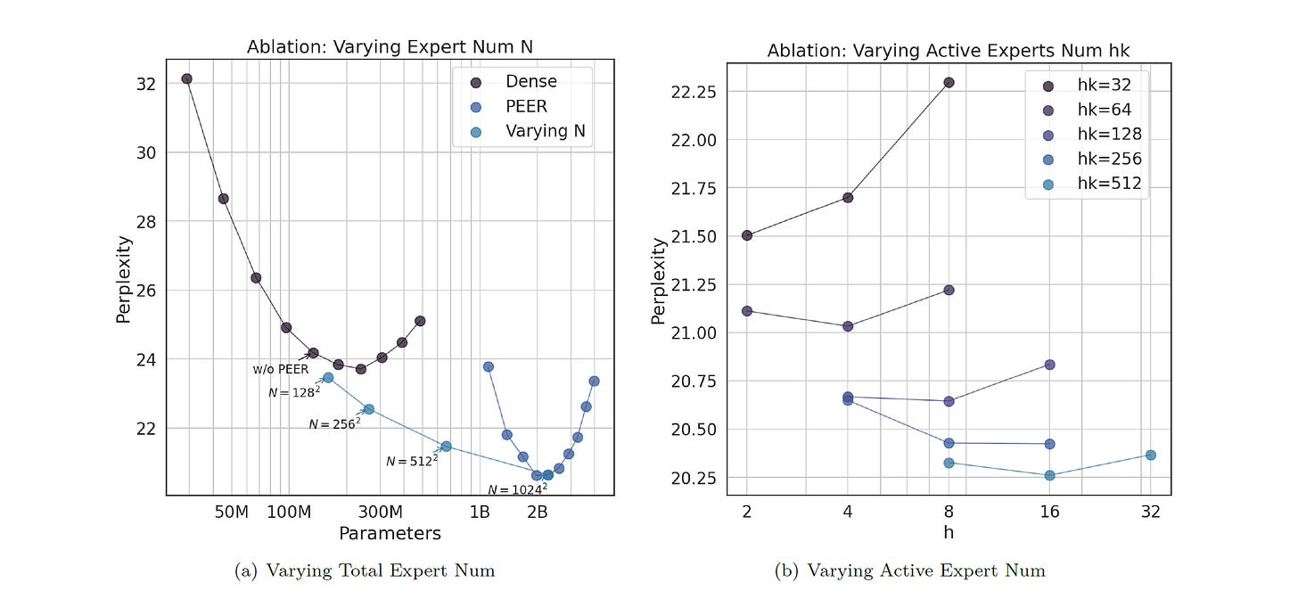 The researchers next study how varying numbers of total and active Experts affected perplexity.