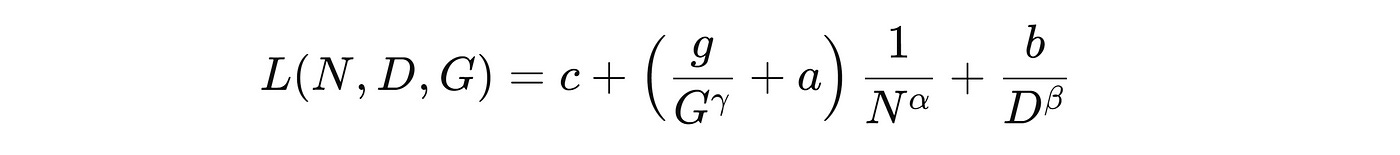 L(N,D,G)is the final test loss of the MoE modelNis the total number of non-embedding parametersDis the number of training tokensGis the Granularity or the number of active Expertsa,b,g,γ,α,βare constants