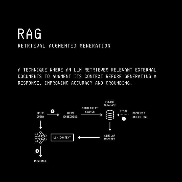 - Augmentation: the step where the retrieved information is added to the LLM’s input context to augment its available knowledge while answering a query.