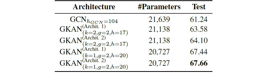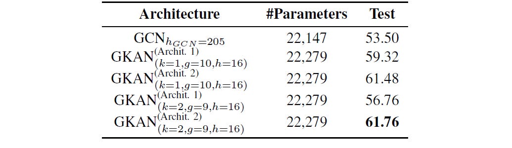 Notably, the GKAN Architecture 2 achieved 61.76% accuracy compared to 53.5% for GCN.