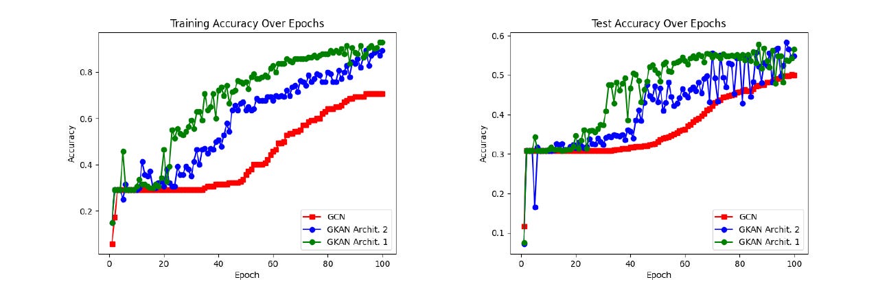 They found that GKANs achieve higher accuracy in semi-supervised learning tasks on a real-world graph dataset (Cora) than the traditional ML models used for Graph Deep Learning, i.e. Graph Convolutional Networks (GCNs).