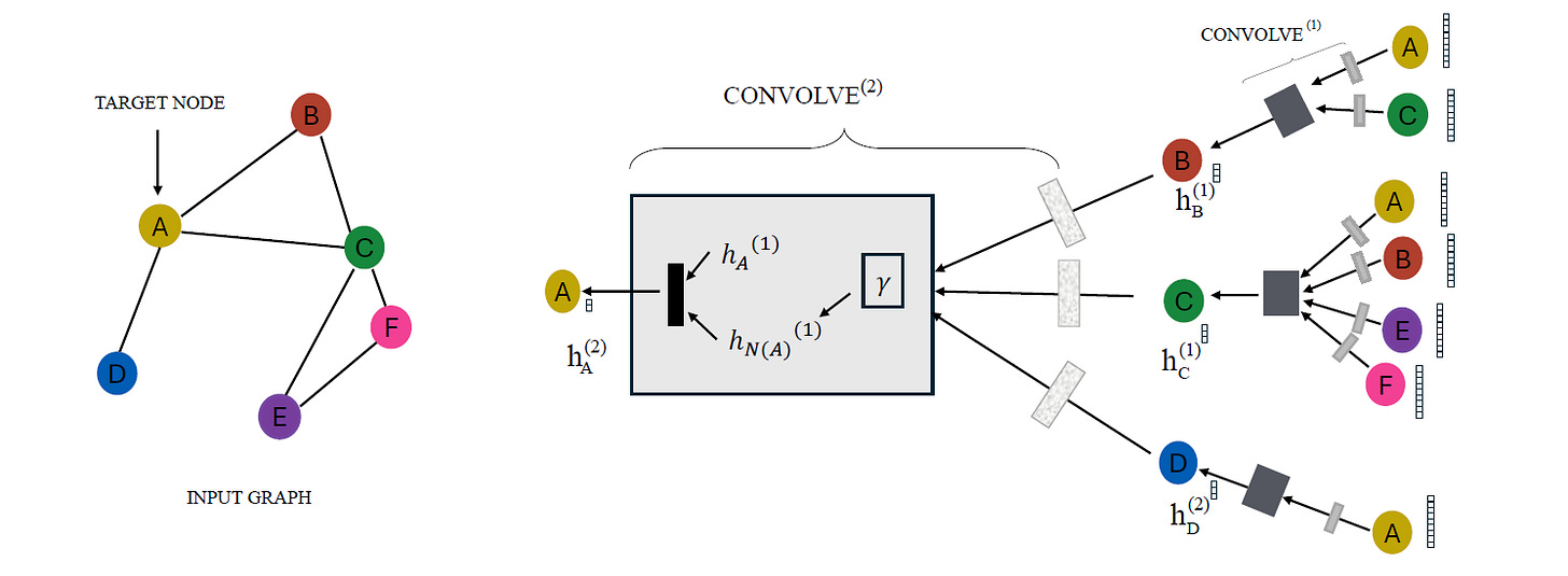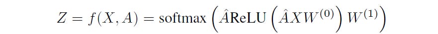 A simple two-layer GCN’s forward propagation (used for node classification) can be expressed as follows: