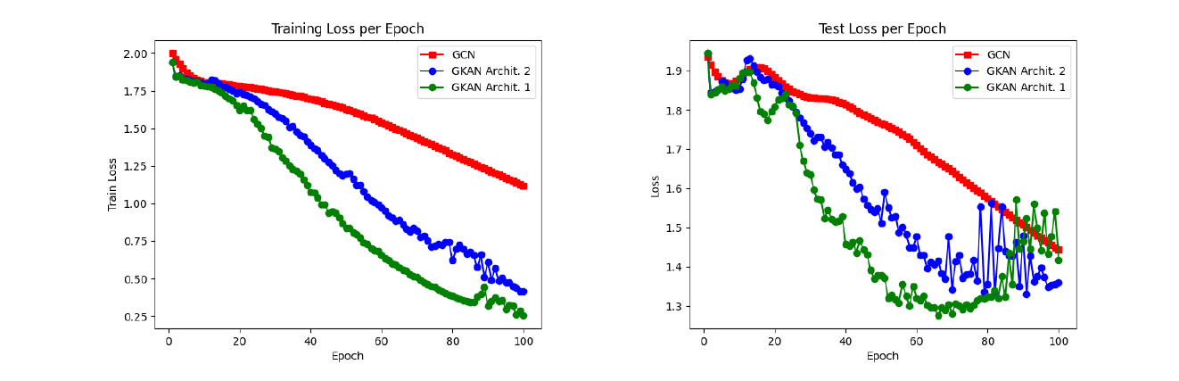 It was also noted that GKAN architectures showed a sharper decrease in loss values during training and required fewer epochs to be trained.