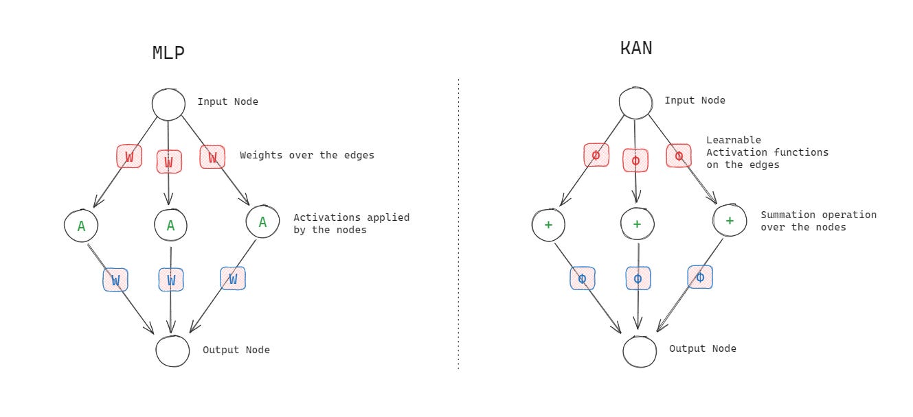 Unlike MLPs where each edge has an associated weight parameter, in a KAN, these weights are completely replaced by learnable univariable functions.