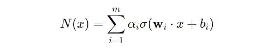 mis the number of neurons in the hidden layerα(i) are the weights on the edges that connecti-th neuron in the hidden layer to the output layerσis the activation functionw(i)are the weights on the edges that connect the input layer to thei-th neuron of the hidden layerxis the input vector to the neural networkb(i)are the biases associated with eachi-th neuron in the hidden layer