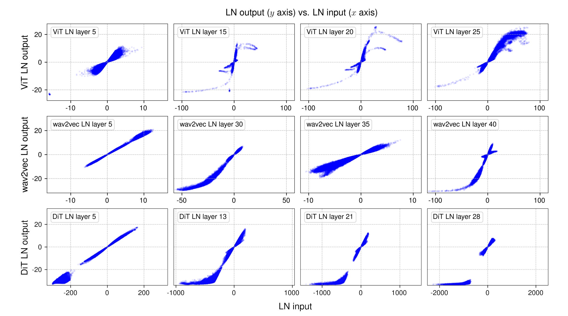 Note how LayerNorm brings the extreme values of token activations (for example, input values larger than 50 or smaller than -50 in the plots) in line with the majority of points. This leads to the non-linear ends of the S-shaped curve.
