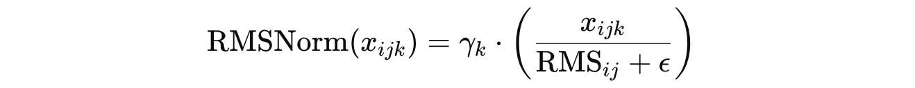 This makes the RMSNorm formula (note the emission of the affine shift β term):