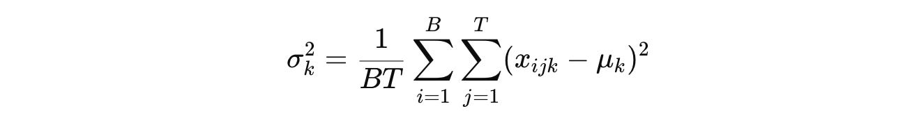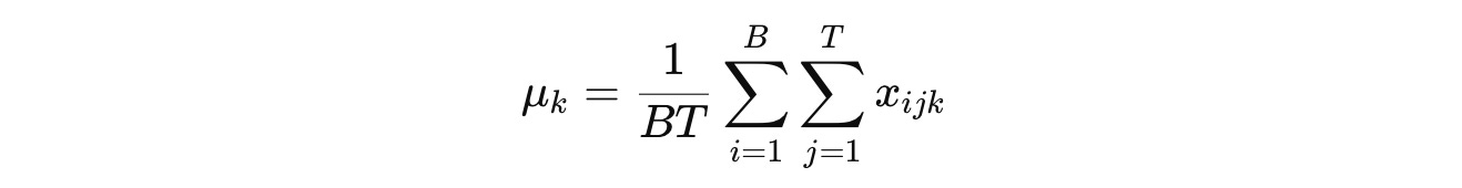 Batch Normalization (BatchNorm or simply BN), which was primarily intended to be used in CNNs, involves computing the mean μ and variance σ² for each channel C indexed by k across both the batch (B) and token dimensions (T) as: