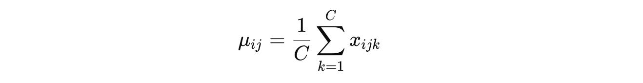 In LayerNorm, the mean (per sample and token) is calculated as: