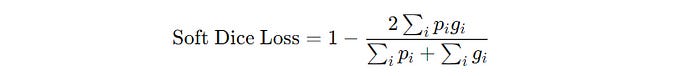 For it to function as a loss function that decreases as the model improves, a differential version of the Dice loss called ‘Soft Dice loss’ is defined as follows —