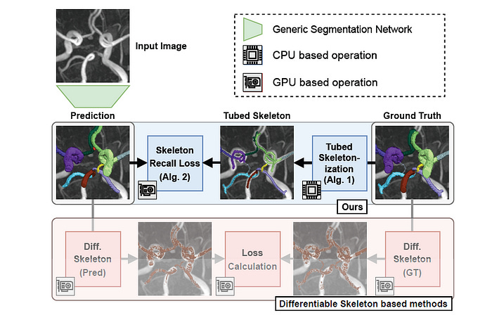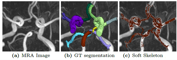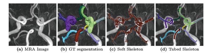 After Tubed Skeletonization, a ‘soft’ (differentiable) Recall Loss function is used that incentivises a neural network to predict segments that include as much of the tubular skeleton as possible.
