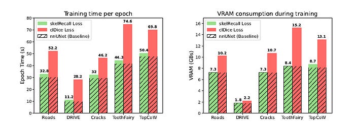Skeleton Recall Loss minimally increases VRAM usage (2%) and training time (8%) as compared to cl-Dice Loss over the plain nnUNet backbone.