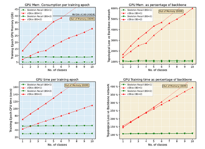 Skeleton Recall Loss excels in multi-class segmentation and outperforms clDice Loss, which becomes infeasible due to high memory usage (note the Out-of-Memory error shown below) and training time as the number of classes increases.