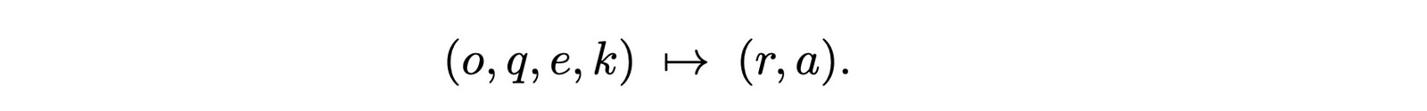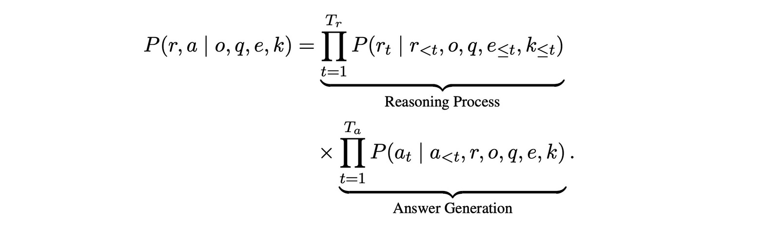 The probability that the reasoning LLM will generate the reasoning chain r and the final answer a given the inputs (o, q, e, k) is given by —