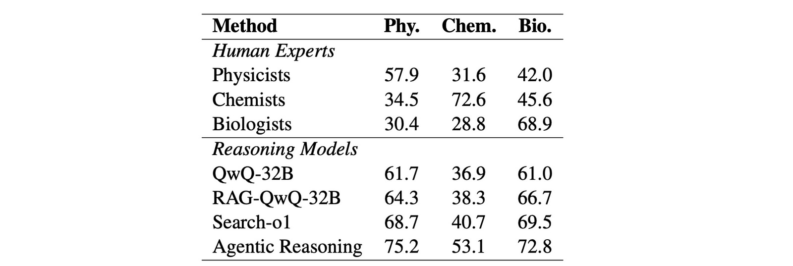 Agentic Reasoning surprisingly outperforms Gemini Deep Research across all these questions from the three subjects, as seen in the plots below.