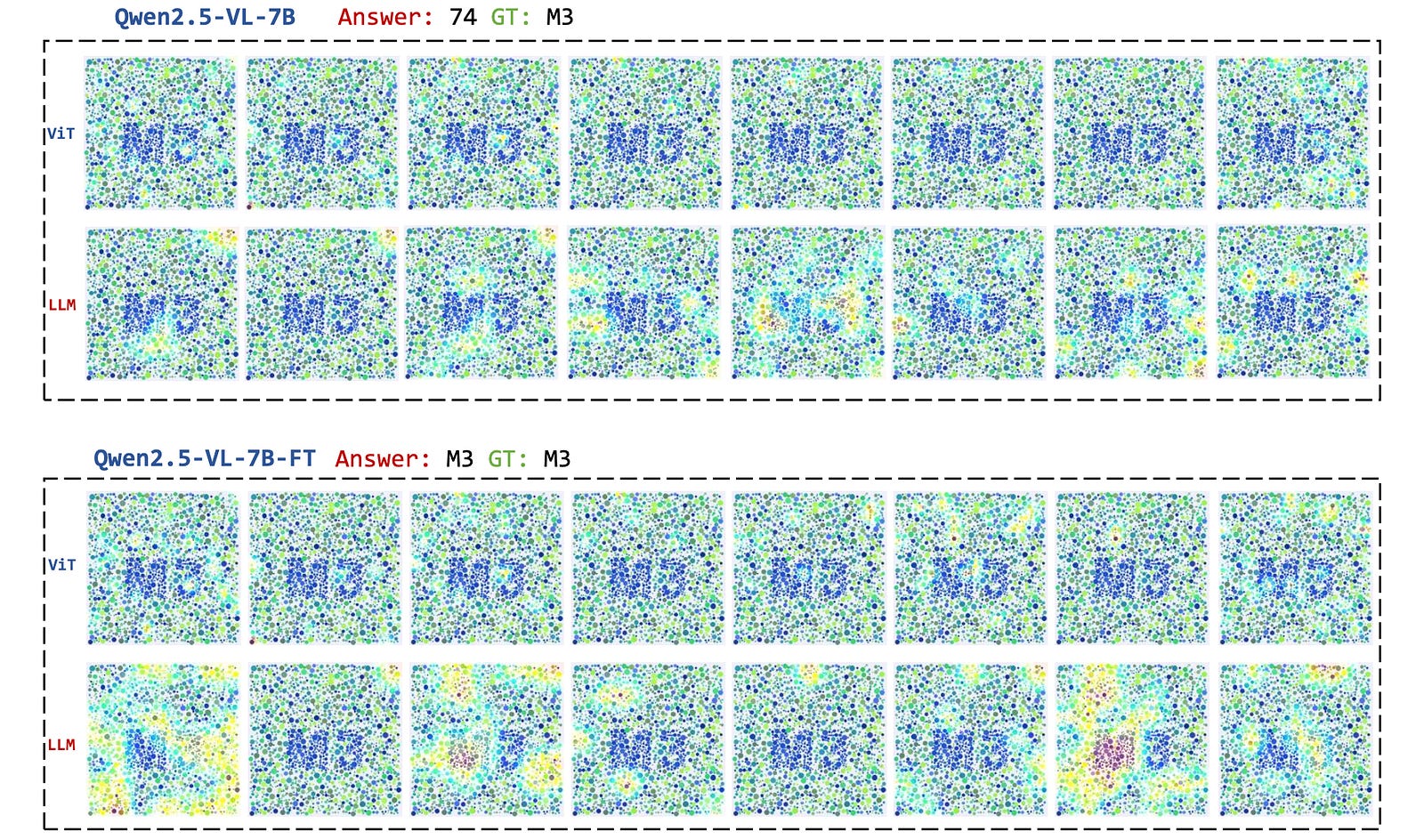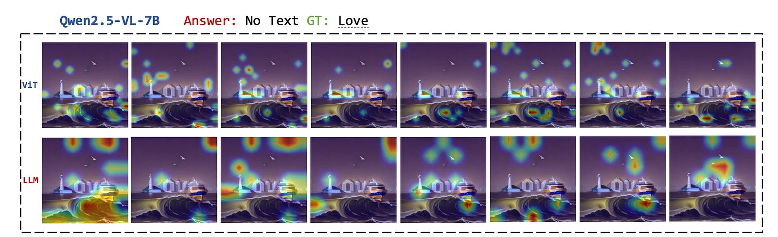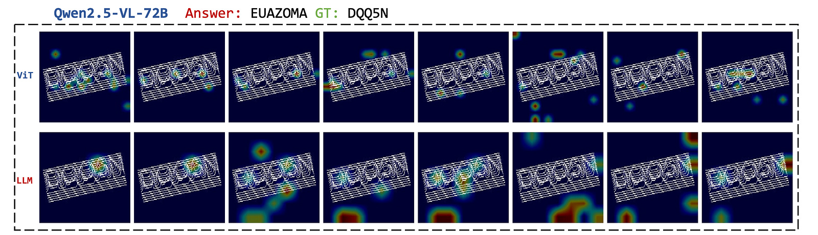 When this method is applied to Qwen2.5-VL, it is seen that the Vision encoder of the model, which is meant to extract meaningful visual features from images, focuses on irrelevant areas or only parts of the correct characters.