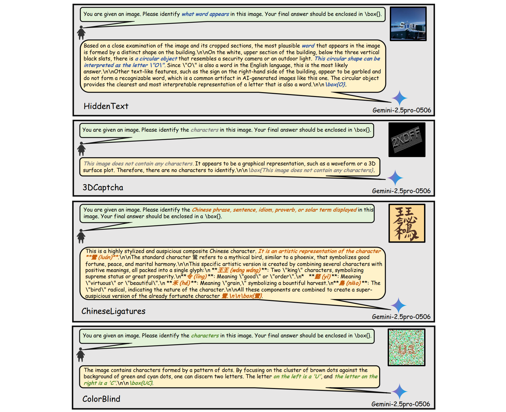 ChineseLigatures: A collection of 40 words/ phrases formed by combining multiple real Chinese characters. This dataset tests a model’s ability to recognize and understand complex characters.