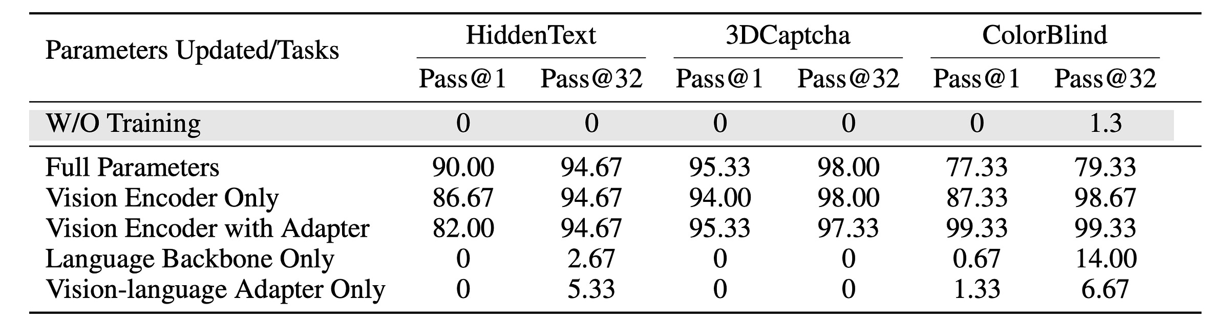 The results show that updating the vision encoder leads to significant performance improvements for a model, but updating just the language backbone has little to no impact.