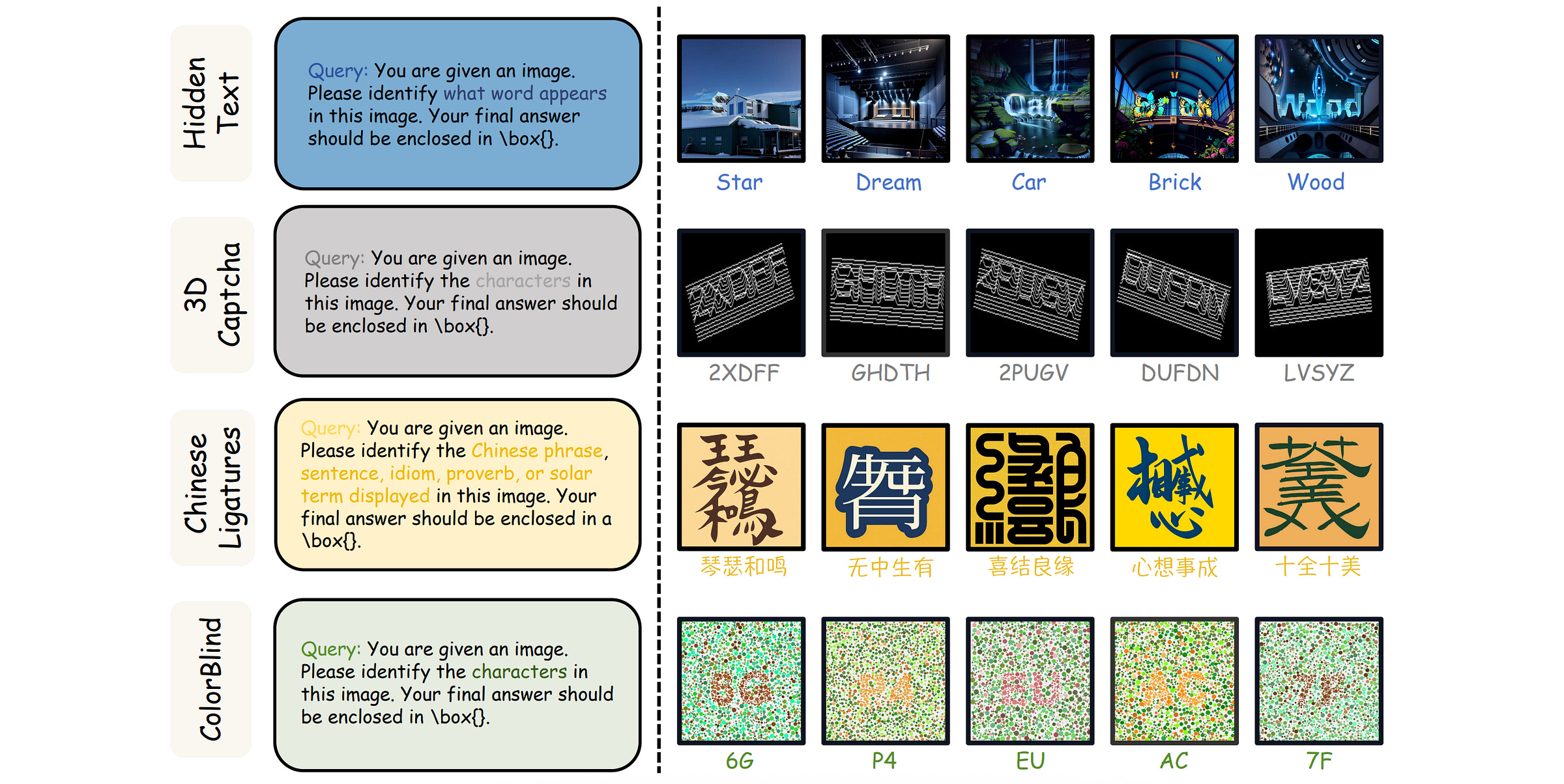 ColorBlind: A collection of 150 images that are inspired by Ishihara tests for color blindness. These images hide characters among similarly colored dots and test a model’s pattern perception in noisy, color-confusing environments.