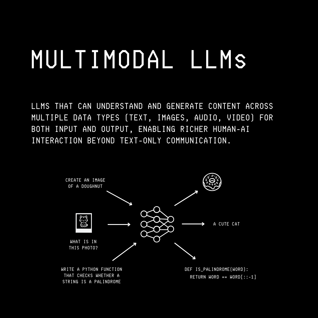 Multimodal LLMs (MM-LLMs) are language models with augmented capabilities. They can not only understand text but also operate across multiple data modalities (video, audio, and images), either as their inputs or outputs.