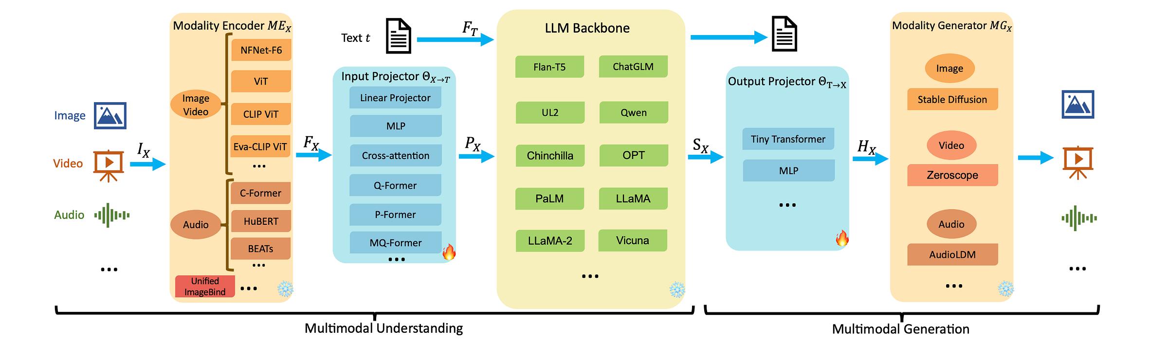 Modular: These models connect encoders and generators of different modalities into an LLM using lightweight projection modules.