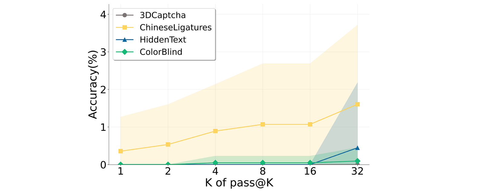 While some models show slightly better performance at Pass@32 (i.e., if the model tries 32 times, it gets the answer right at least once), the improvement of a few percent is practically negligible.