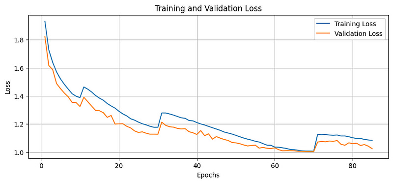 plt.show()As noted with these plots, the training and validation loss decreases, and the accuracy improves over the epochs until the 85th epoch (beyond which Early Stopping is triggered).
