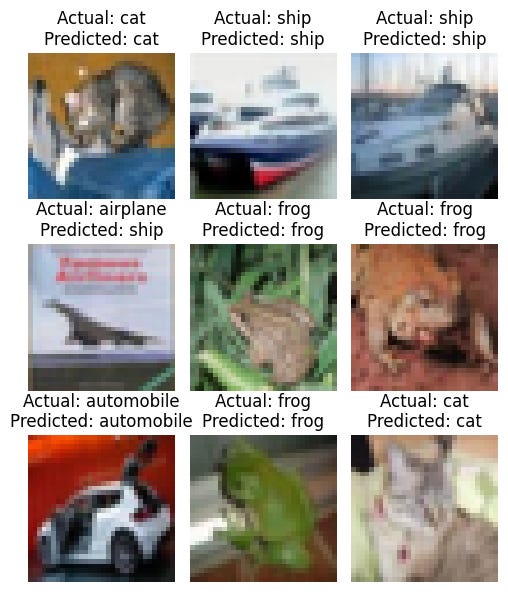 Plots a grid of images from the dataloader with actual and predicted labels.
