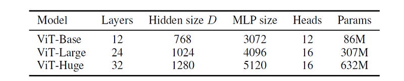 The following ViT models of varying sizes are pre-trained in the original research paper.