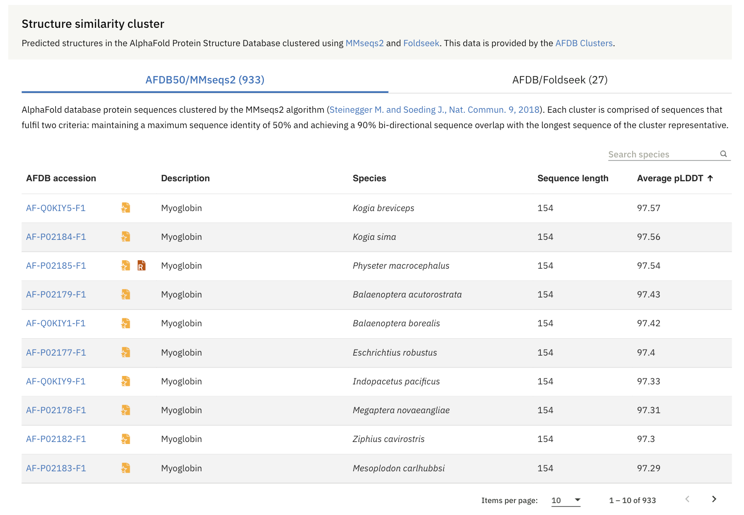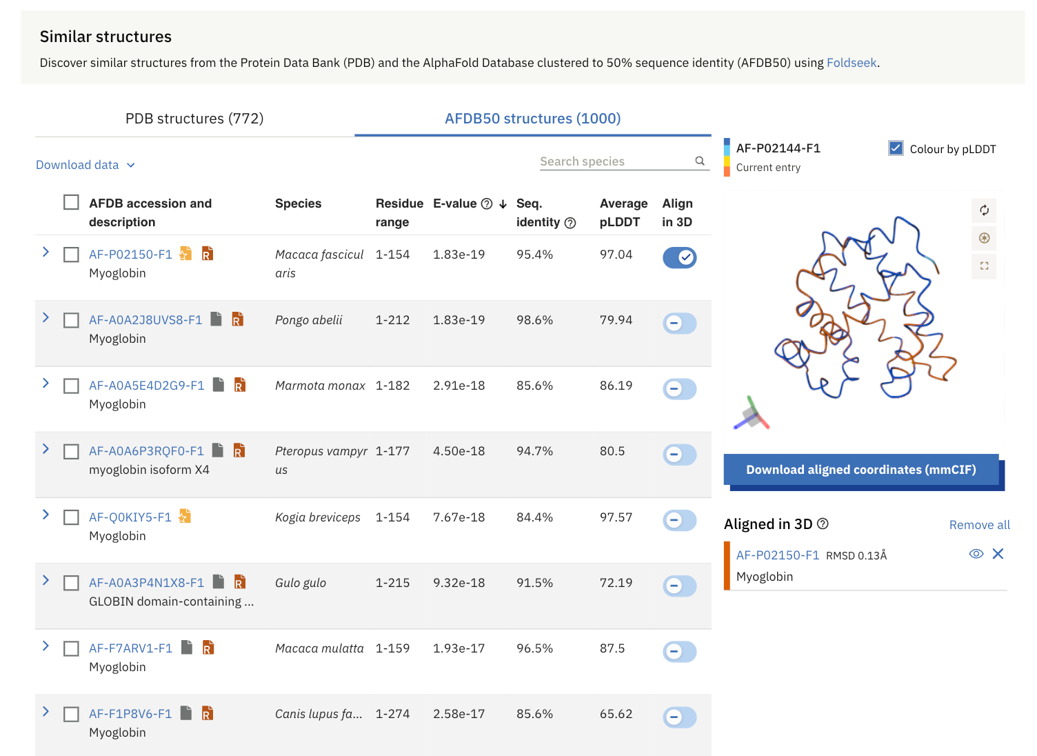 Similarly, from AFDB50, the most similar protein to human Myoglobin is the Myoglobin from Crab-eating macaques (Macaca fascicularis).