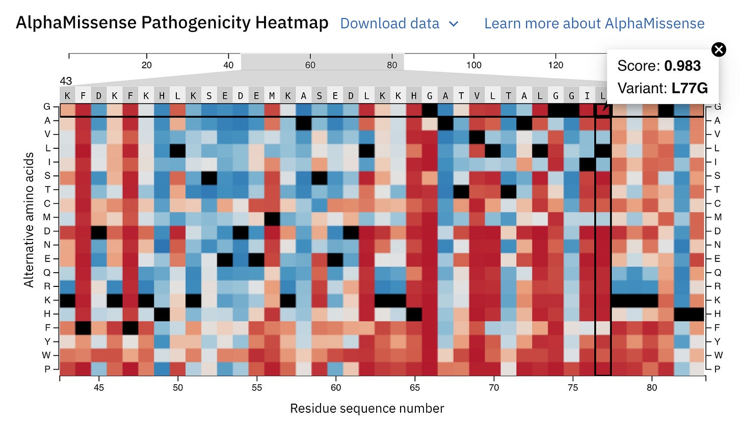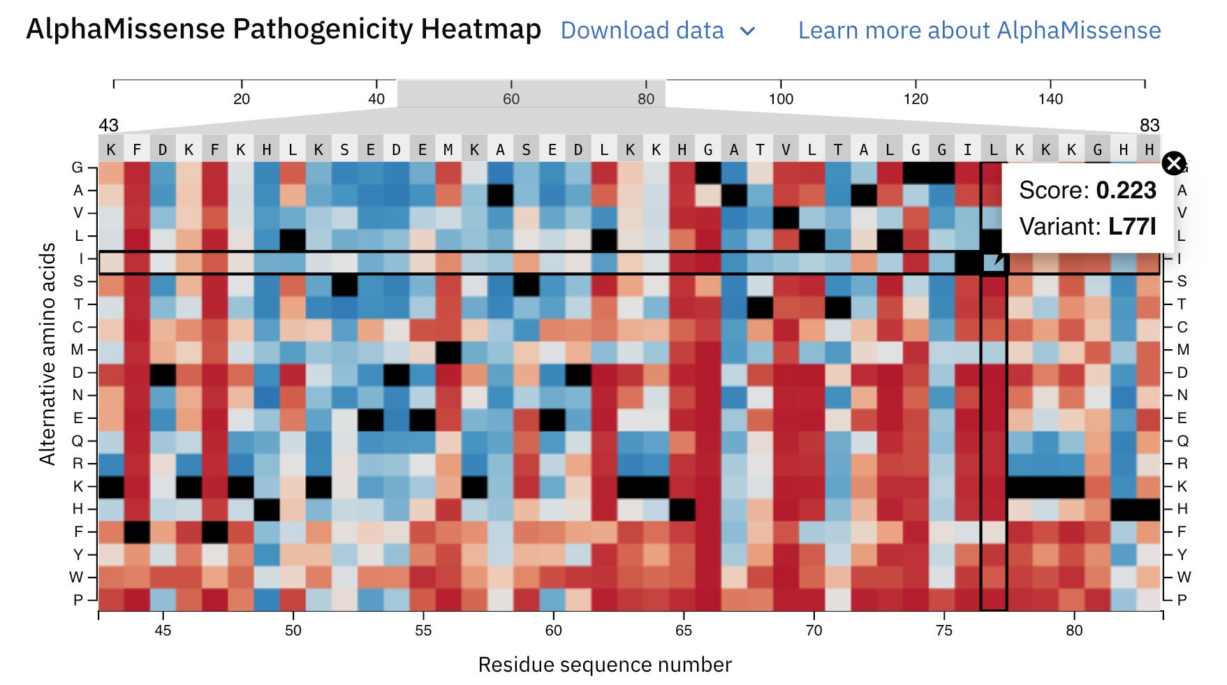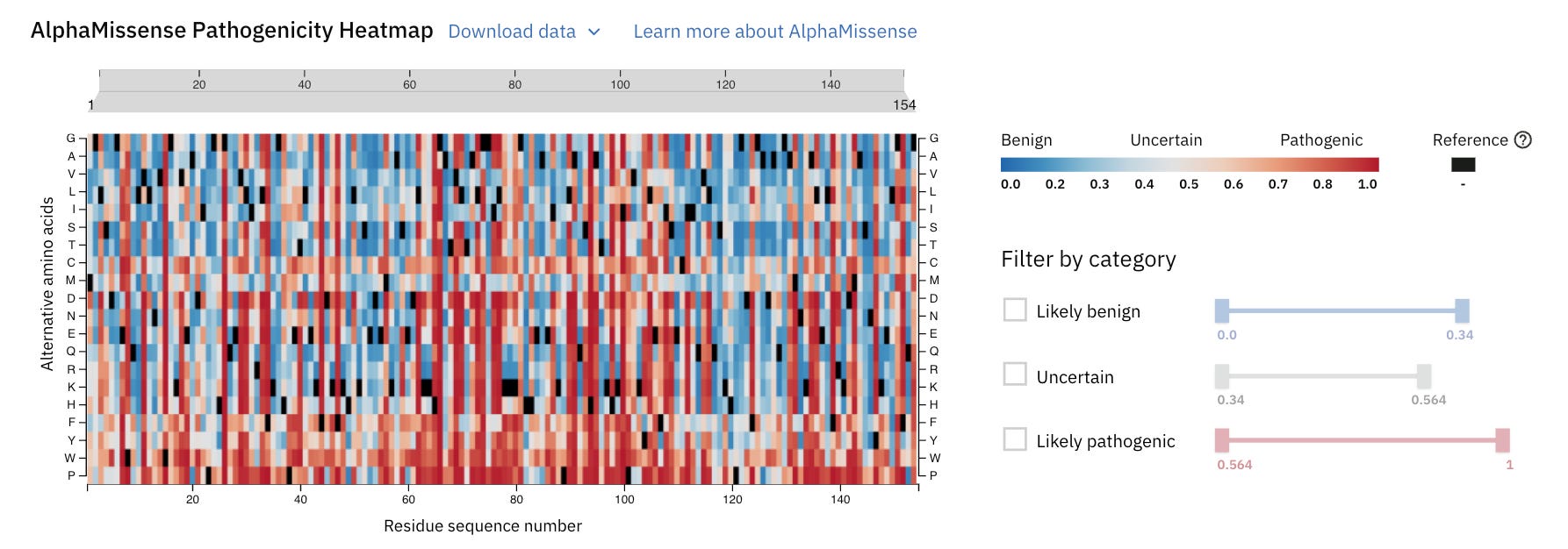 AlphaMissense returns a pathogenicity heatmap for each protein prediction with the above categories colour-coded.